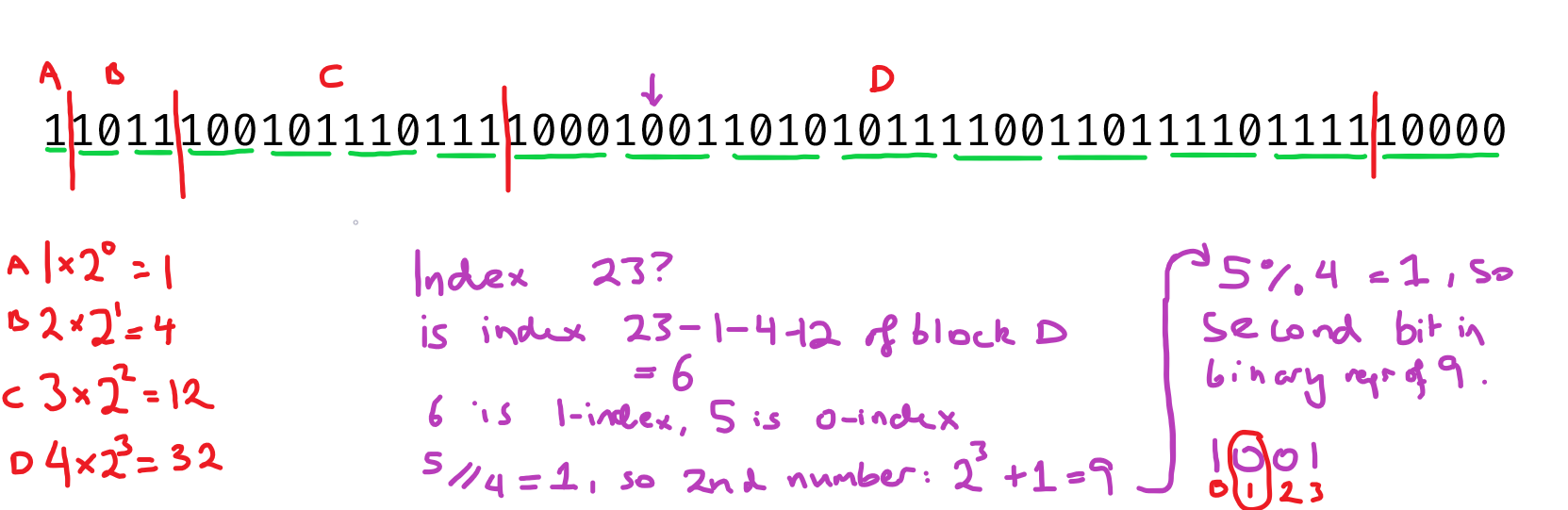 Now we know that after dealing with the first $p$ digits (Which contains all binary strings with less than $k+1$ length), we are left to find the $i-p^{th}$ value in the sequence of binary strings of length $k+1$. But since all binary strings are the same length now, we know we’re actually looking at the $\frac{i-p}{k+1}^{th}$ binary string in that sequence! From here we can just do some indexing to get what we need.