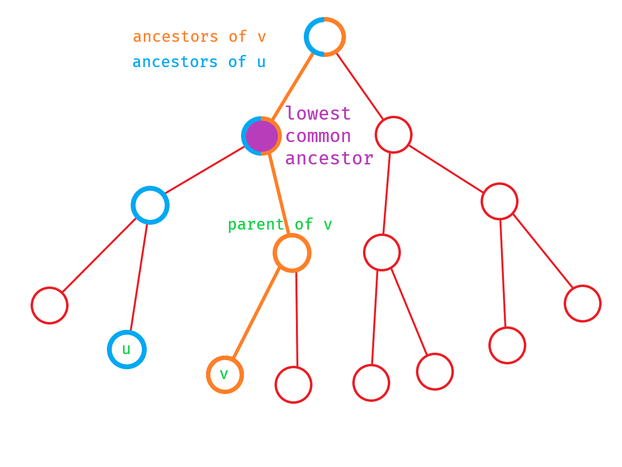 # STEP 2: find the highest ancestor where u != v. Then the parent is the LCA