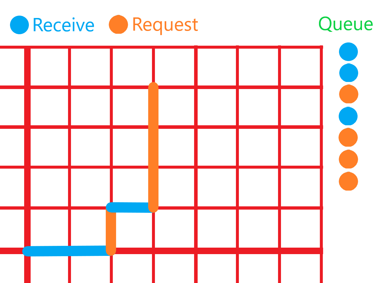 Let’s first view the problem through a different lens, to make the solution a bit more natural. Imagine Andrew is a point on the 2D plane. Whenever a person approaches him to give him a football, he moves one unit in the positive \(x\)-axis, and whenever a person approaches him to request a football, he moves one unit in the positive \(y\)-axis.