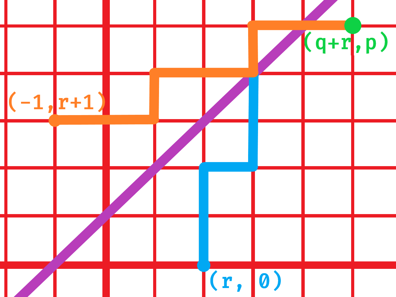 Since \((-1, r+1)\) is the mirrored version of \((r, 0)\), all of these new paths are distinct paths from \((r, 0)\) to \((r+q, p)\). Furthermore, since the original paths hit the line, each of the these mirrored paths also hit the line and are therefore invalid. Hopefully it’s also easy to see that every possible invalid path can be reached via this mirror method.